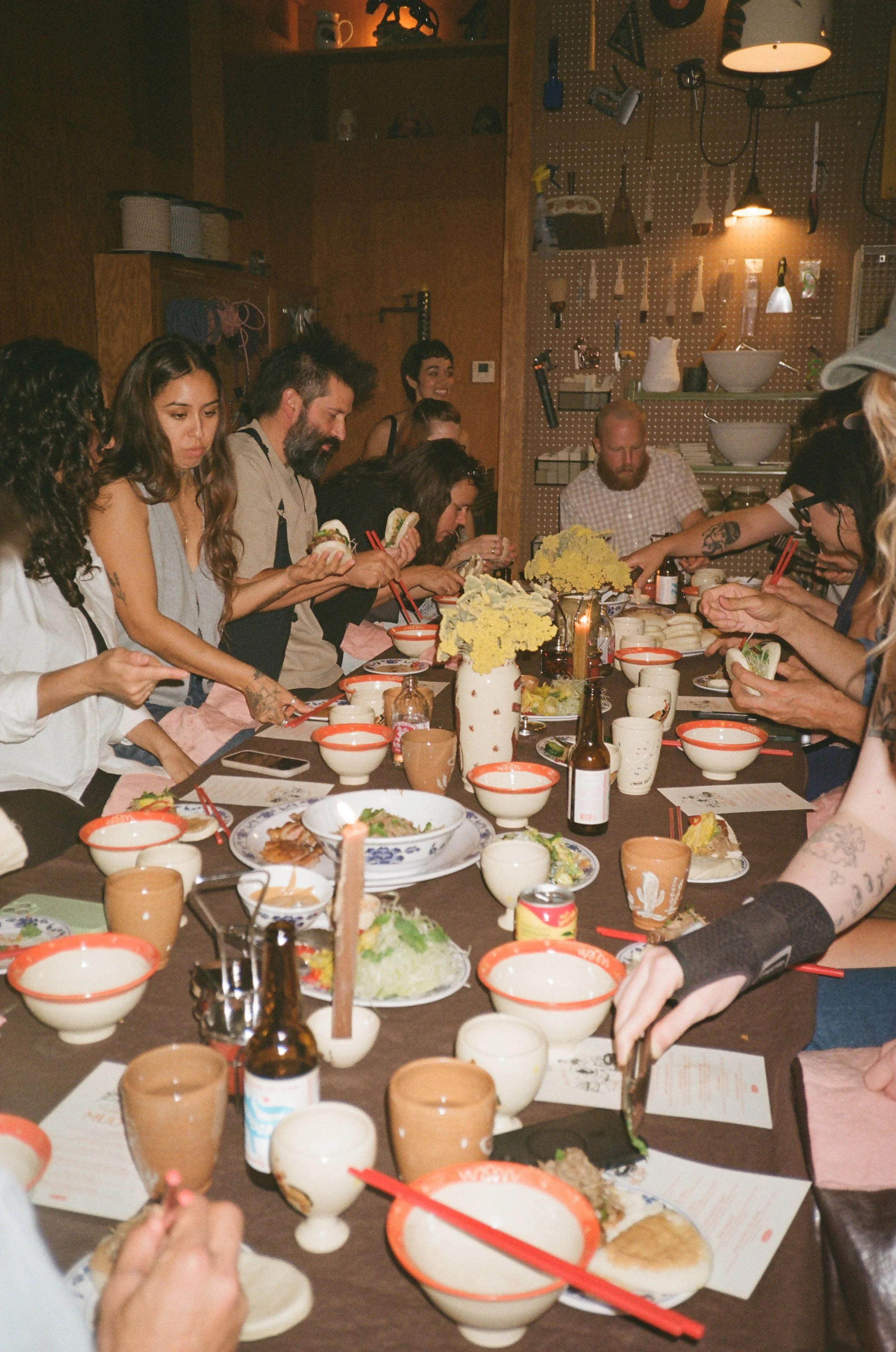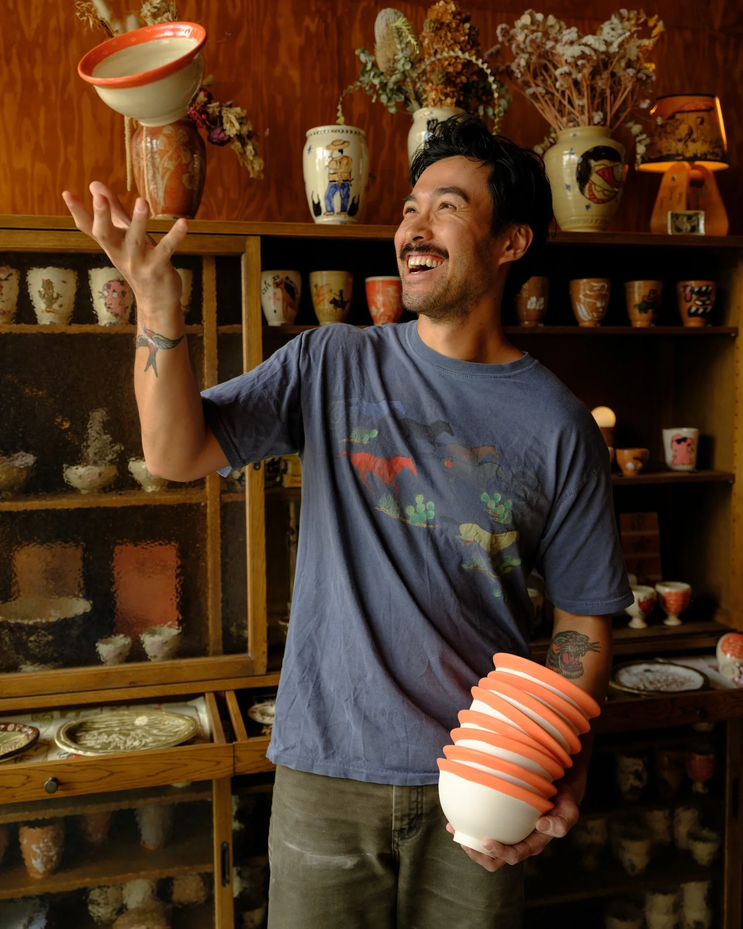 Somm-turned-ceramicist Daniel Dooreck started his studio, Danny D’s Mud Shop, out of a garage in Echo Park. Now based in East Hollywood, the shop makes Danny's signature hand-thrown, carved and painted pieces. In the early Woon days, Danny would eat noodles out of his truck in front of Woon and one day he gifted us with one of his early pieces, a custom Woon jar with a lid. We still have it in the office to hold our matchbooks. Fast-forward and we got to do a nice intimate dinner inside his studio and collaborate on the perfect Woon noodle bowl.