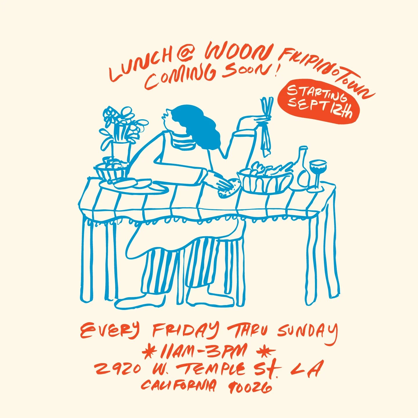 It’s finally here LUNCH at Woon Filipinotown! Starting this Friday, September 12, join us Every Friday - Sunday from 11 AM - 3 PM for a lunch-only menu featuring a Scallion Pancake Beef Roll, 3 Cup tofu Over rice, Sesame Gem Salad, Wings, Five Spice Chocolate chip cookie + more.